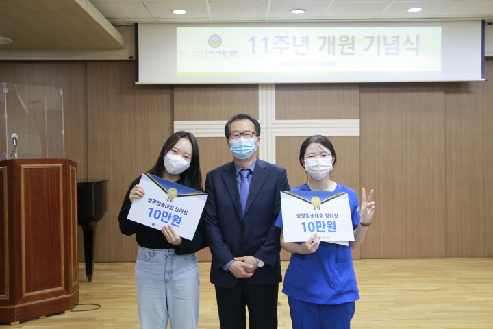 성경암송대회 결과 1등은 물리치료실 천수진 치료사, 2등 물리치료실 이현석 치료사, 3등 정은숙 간호과장,