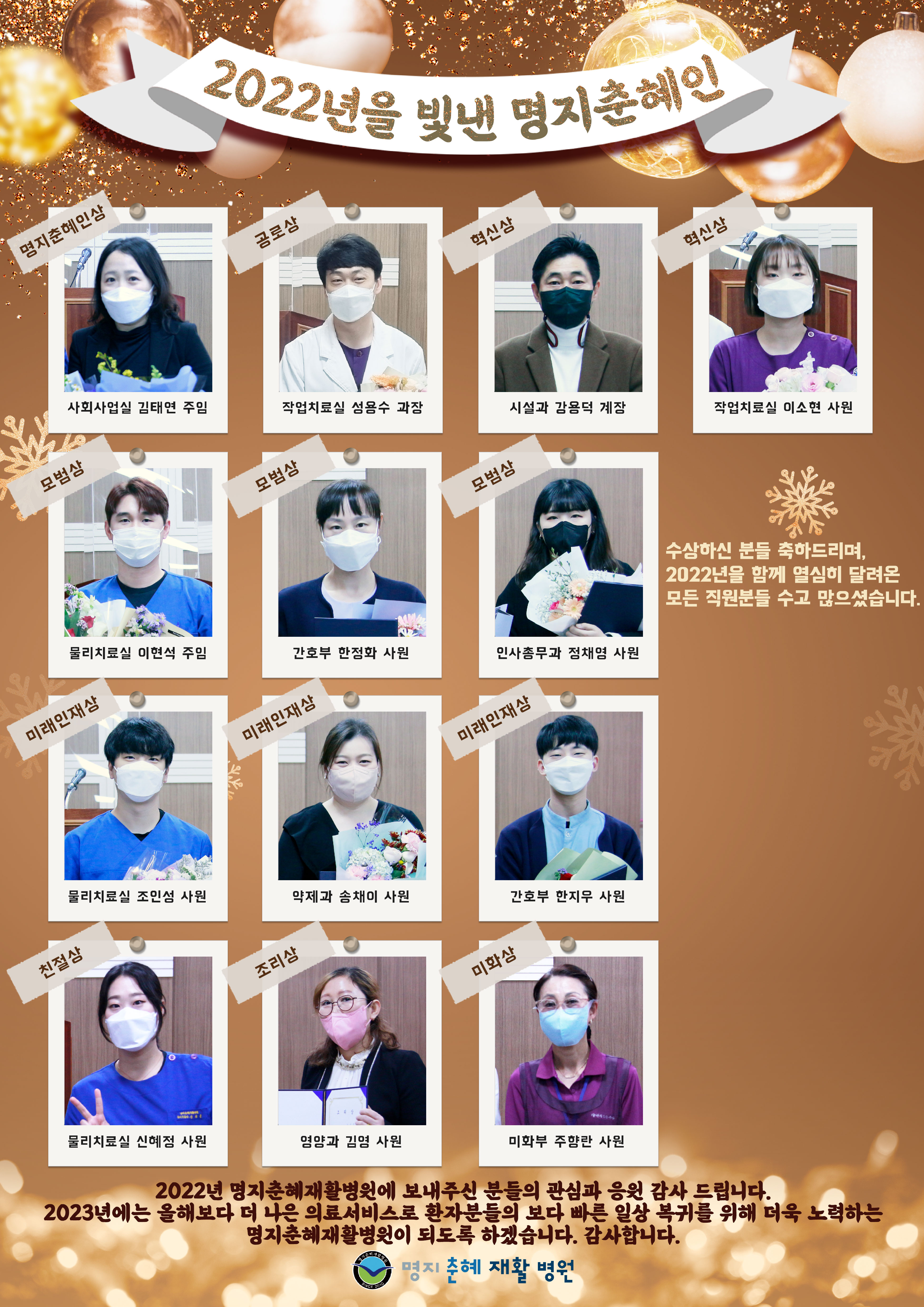 명지춘혜재활병원의 모든 부서, 구성원들이 올 한해 열심히 달려왔다는 것을 우리 모두 알고 있습니다.