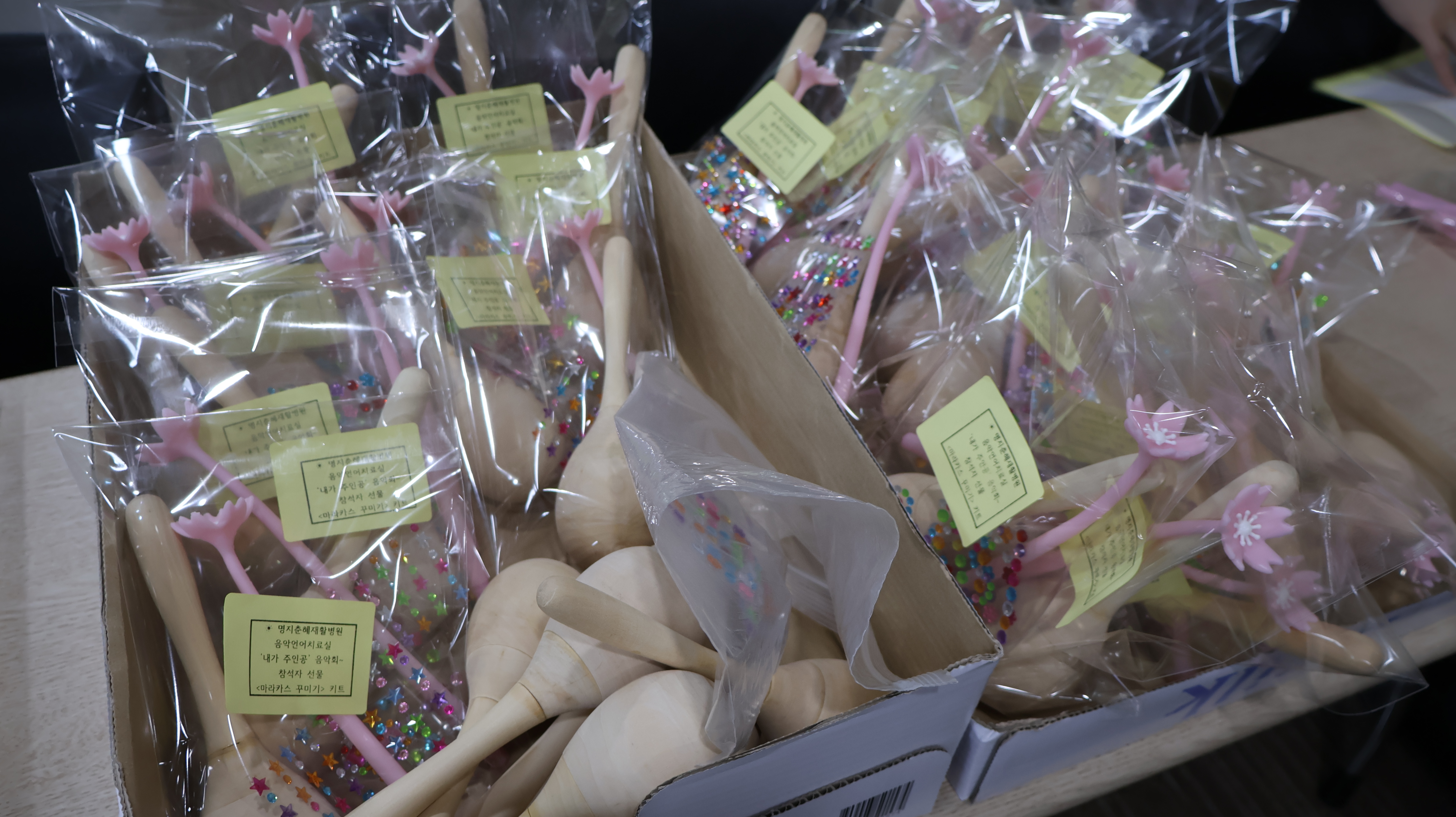 환자분들을 위해 준비한 마라카스와 꾸미기용 스티커입니다. 잠시 후 예쁘게 변신할 예정입니다.