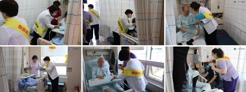 환자분들 한 분 한 분 방문하여 낙상 예방에 대한 말씀도 드리고 불편한 사항이 있을 때는 꼭 콜벨을 눌러 달라고도 말씀 드렸습니다.
