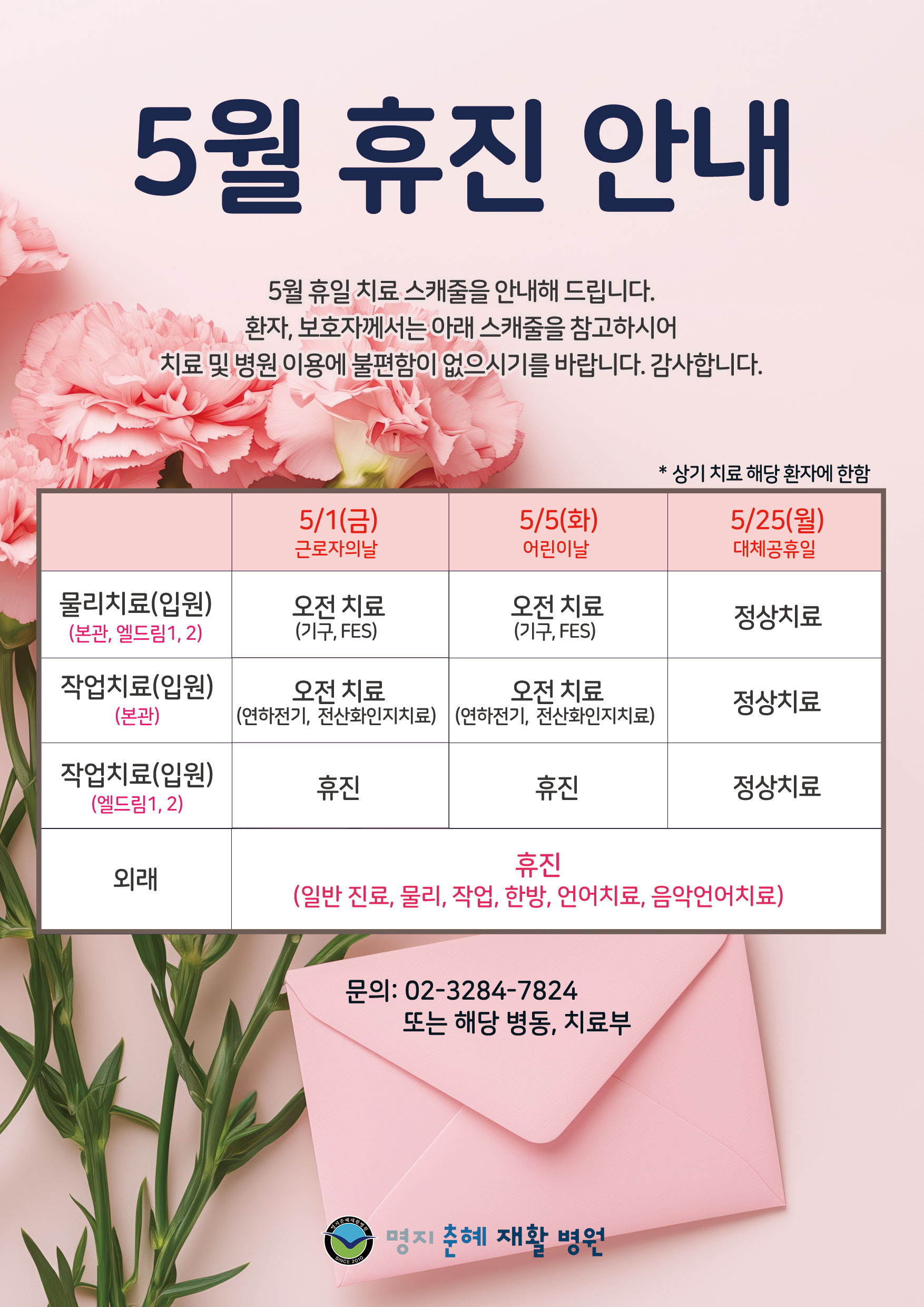 5월 휴일 치료 스캐줄을 안내해 드립니다.